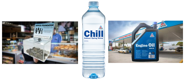 Our Water: On sale at all APCO Service Stations, 10c from every Chill Water bottle sold is donated to The APCO Foundation.